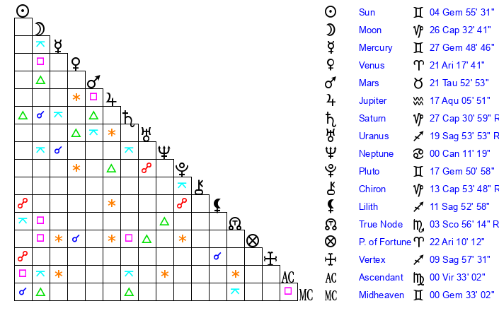 | Mercury | 27 Gemini 56 | 2 Gemini 41 | 29 Libra 8 |