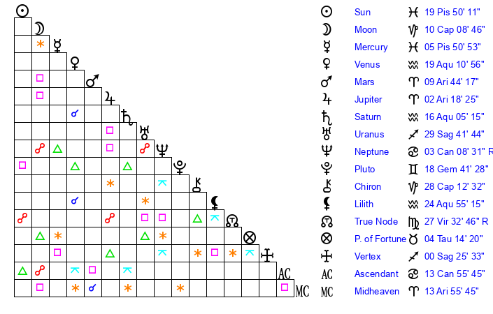 | Venus | 18 Aquarius 30 | 9 Aries 25 | 16 Cancer 51 |