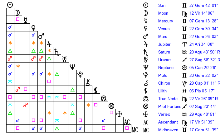 | Pluto | 20 Gemini 23 | 3 Aquarius 21 | 21 Gemini 36 |