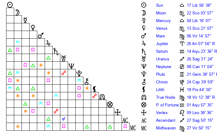 | Mercury | 3 Libra 34 | 6 Scorpio 46 | 0 Aquarius 4 |