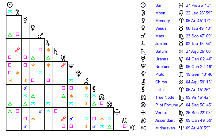 | Sun | 27 Pisces 1 | 27 Pisces 55 | 23 Cancer 2 |