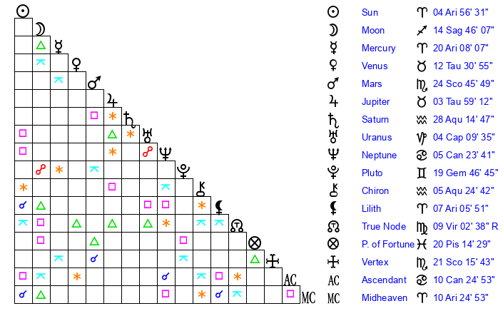 | Moon | 14 Sagittarius 46 | 22 Aquarius 22 | 27 Aries 39 |