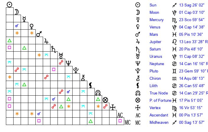 | Sun | 13 Sagittarius 0 | 14 Sagittarius 23 | 12 Aries 7 |
