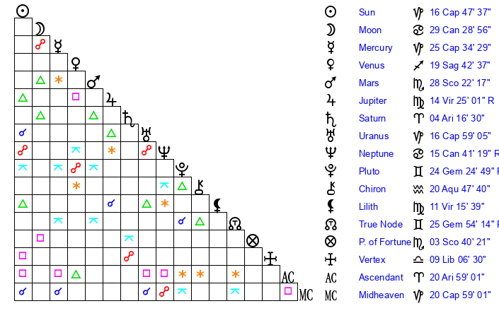 | Mercury | 24 Capricorn 51 | 8 Capricorn 20 | 26 Taurus 54 |