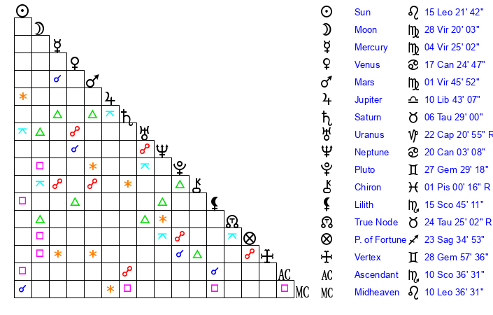 Moon | 21 Virgo 21 | 2 Aquarius 53 | 1 Sagittarius 37 |