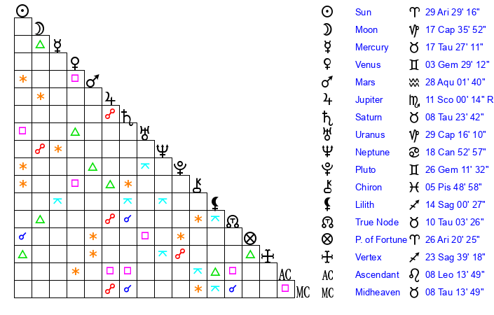 | Mercury | 17 Taurus 16 | 3 Aries 12 | 15 Virgo 47 |