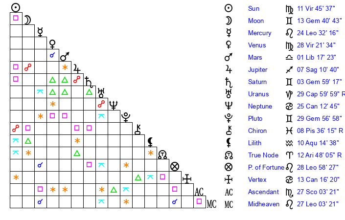 | Venus | 27 Virgo 50 | 11 Leo 29 | 15 Aquarius 57 |
