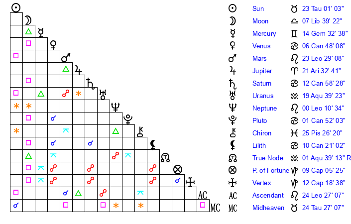 | Venus | 6 Cancer 52 | 9 Aries 15 | 22 Cancer 12 |