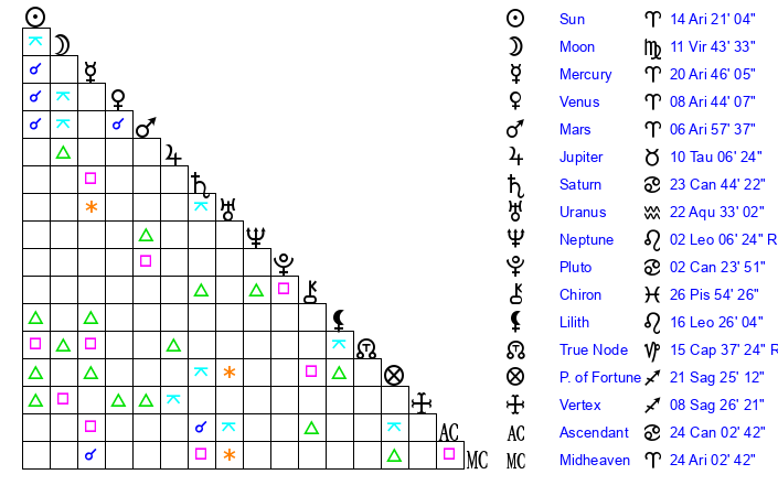 Moon | 6 Virgo 24 | 4 Cancer 29 | 21 Leo 25 |