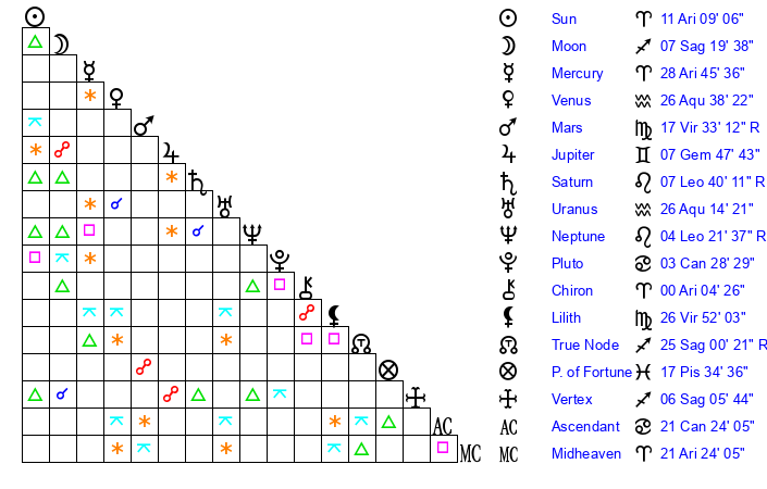 | Sun | 10 Aries 43 | 11 Aries 47 | 23 Cancer 51 |
