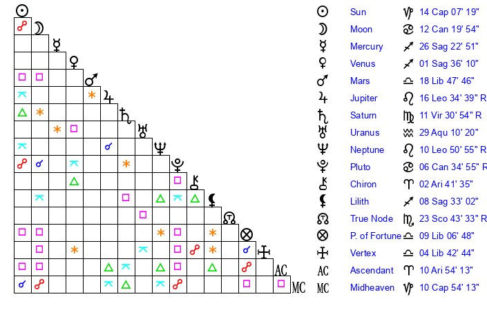 | Mercury | 25 Sagittarius 42 | 5 Capricorn 13 | 2 Aries 41 |