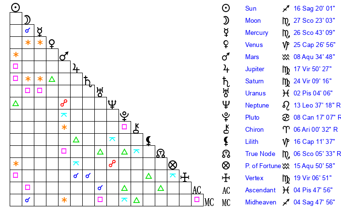 | Mercury | 26 Scorpio 10 | 25 Scorpio 48 | 5 Pisces 37 |