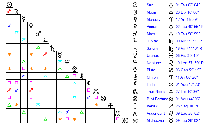 | Venus | 2 Taurus 57 | 25 Pisces 54 | 27 Gemini 25 |