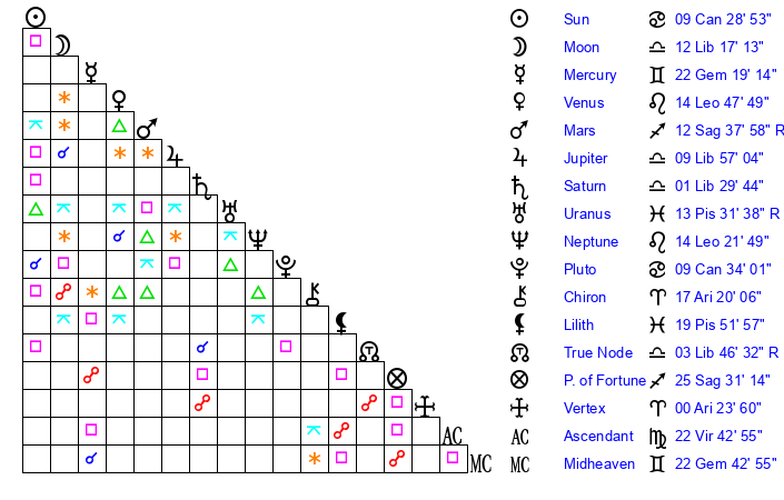 | Moon | 13 Libra 47 | 4 Libra 45 | 11 Cancer 7 |