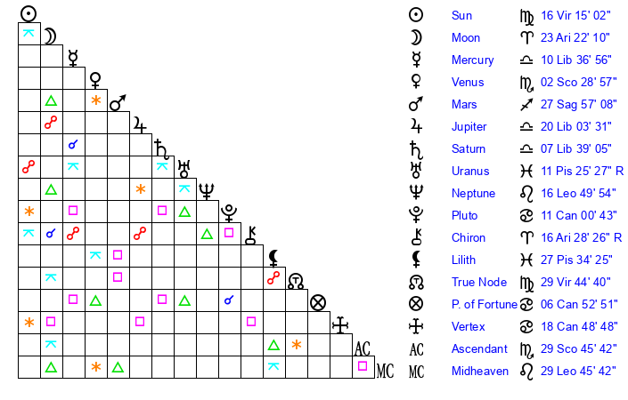 | Moon | 17 Aries 43 | 7 Aries 4 | 2 Aquarius 56 |