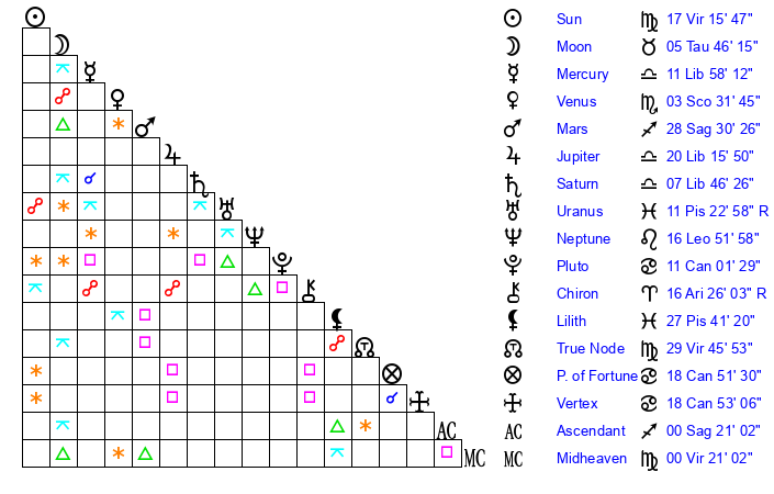 | Sun | 16 Virgo 45 | 17 Virgo 49 | 29 Sagittarius 38 |