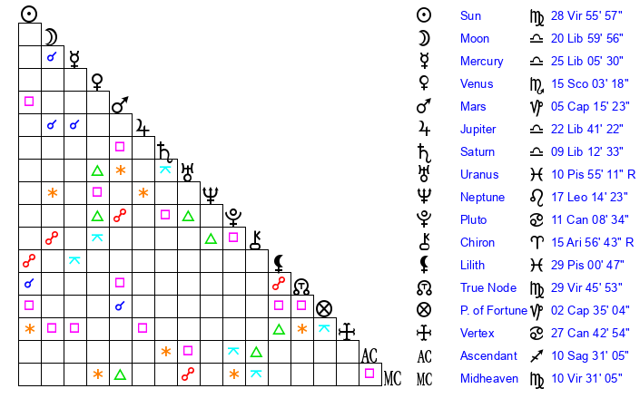 | Saturn | 9 Libra 45 | 28 Pisces 18 | 20 Libra 7 |