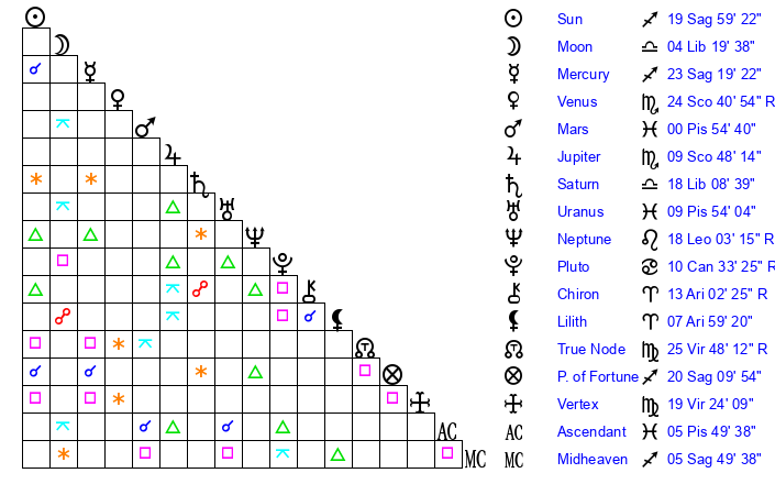 | Mercury | 22 Sagittarius 30 | 0 Sagittarius 24 | 19 Pisces 58 |