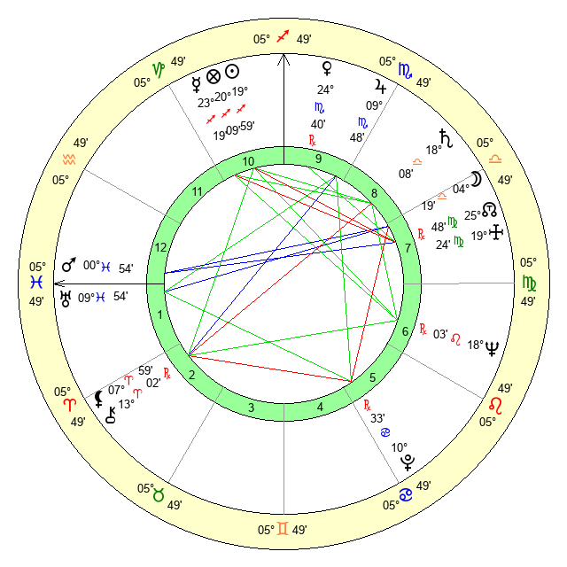 | Moon | 26 Virgo 58 | 25 Virgo 4 | 28 Gemini 32 |