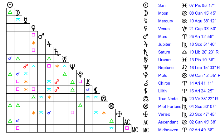 | Moon | 2 Cancer 56 | 14 Aquarius 19 | 7 Aries 7 |
