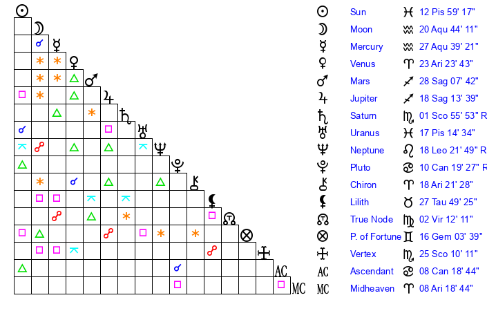 | Sun | 12 Pisces 25 | 12 Pisces 56 | 20 Gemini 59 |