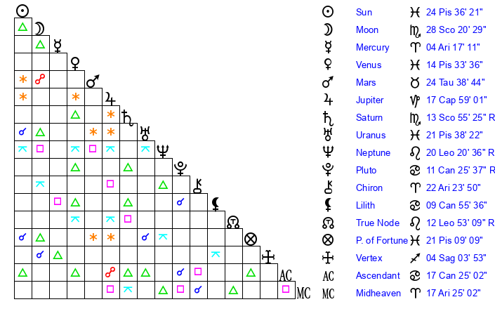 | Sun | 24 Pisces 10 | 24 Pisces 55 | 1 Cancer 16 |