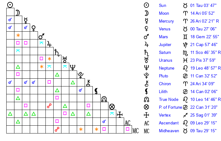 | Sun | 0 Taurus 38 | 1 Taurus 25 | 6 Leo 34 |