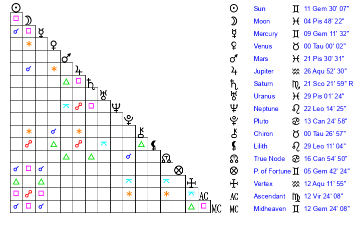 | Sun | 10 Gemini 58 | 11 Gemini 59 | 15 Virgo 49 |