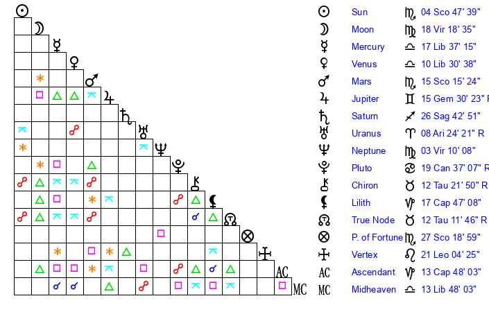 | Moon | 12 Virgo 14 | 18 Capricorn 59 | 8 Pisces 51 |