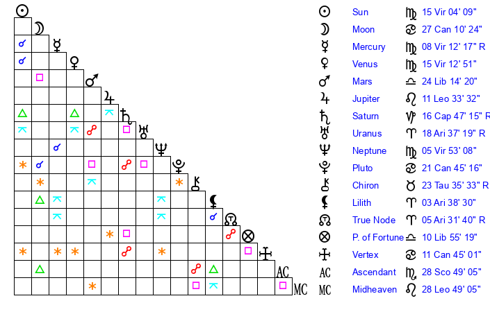 | Venus | 14 Virgo 41 | 16 Leo 19 | 11 Capricorn 54 |