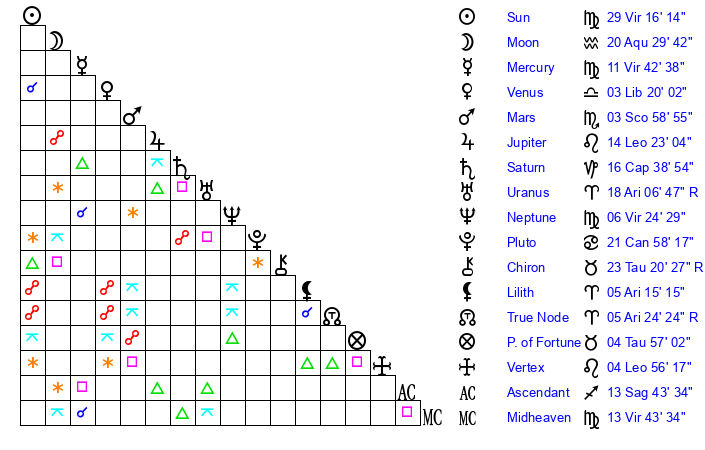 | Neptune | 6 Virgo 25 | 0 Aries 45 | 7 Virgo 55 |