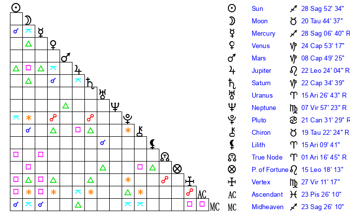 | Mercury | 28 Sagittarius 42 | 12 Sagittarius 40 | 21 Aries 53 |