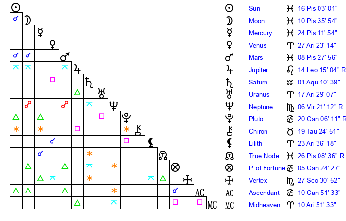 | Mars | 8 Pisces 1 | 17 Cancer 38 | 19 Taurus 6 |