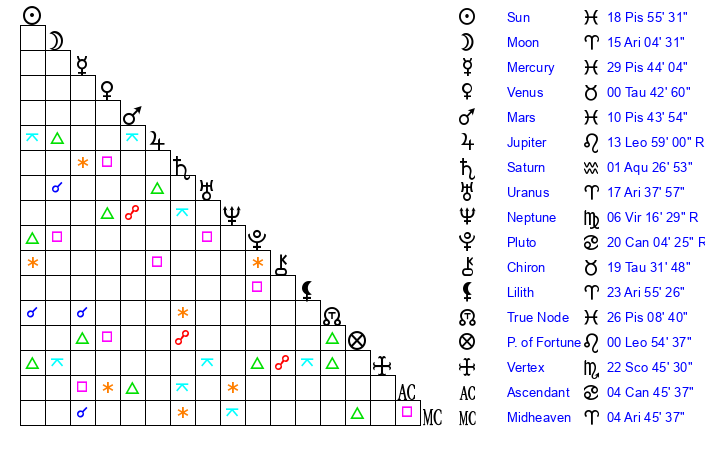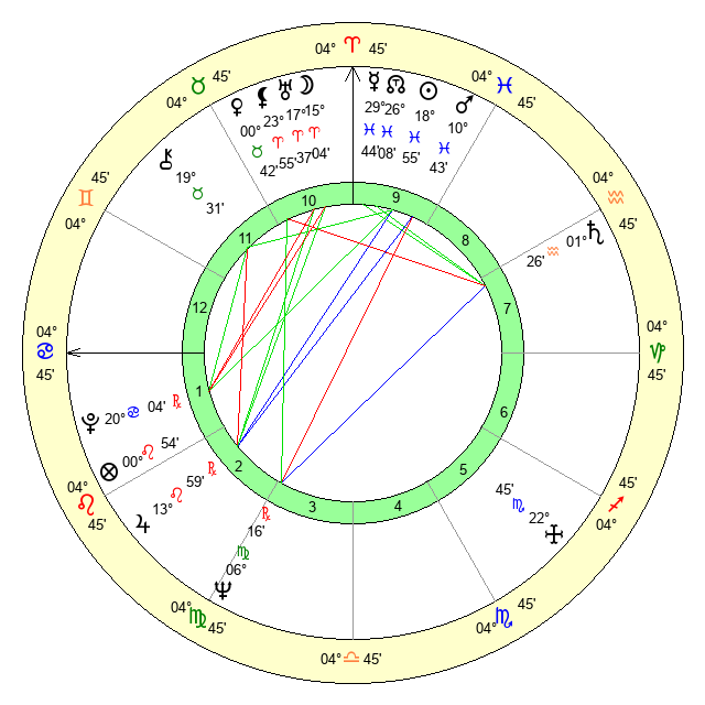 | Mars | 10 Pisces 23 | 18 Cancer 2 | 21 Taurus 17 |