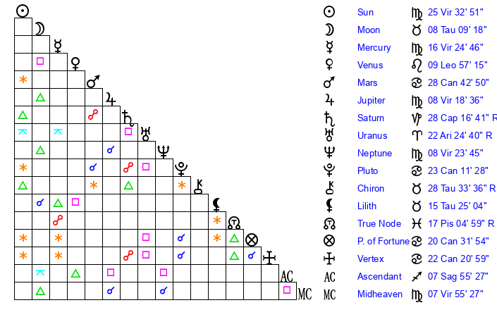 | Sun | 25 Virgo 7 | 25 Virgo 36 | 28 Sagittarius 11 |