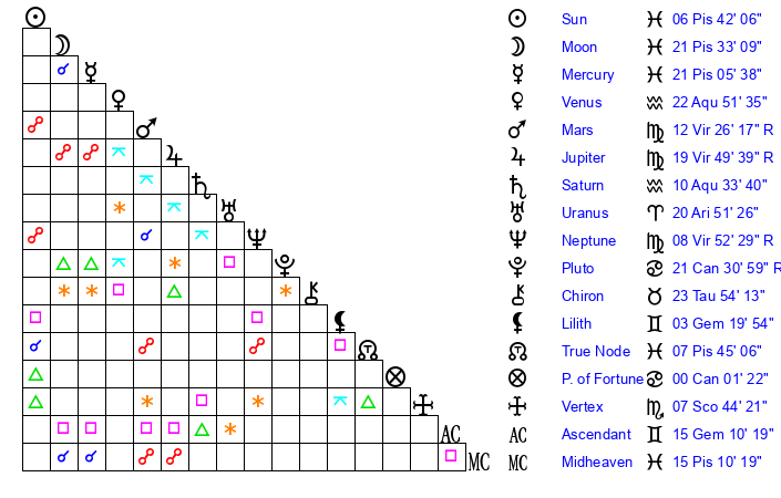 | Mercury | 20 Pisces 16 | 19 Pisces 51 | 5 Gemini 50 |