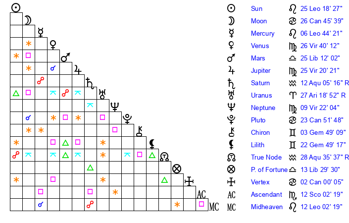 | Neptune | 9 Virgo 21 | 1 Aries 40 | 12 Virgo 10 |