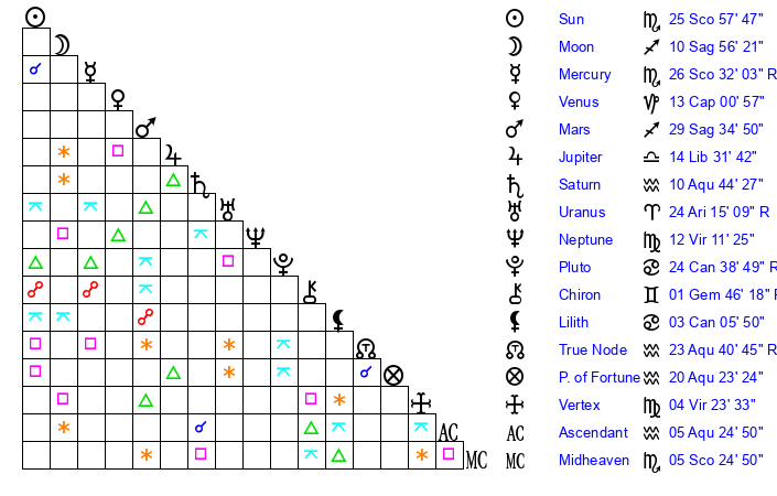 | Moon | 3 Sagittarius 32 | 4 Scorpio 17 | 24 Aries 16 |