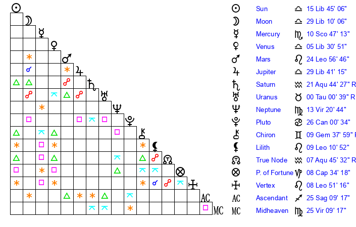 | Moon | 23 Libra 0 | 15 Taurus 38 | 29 Aquarius 19 |