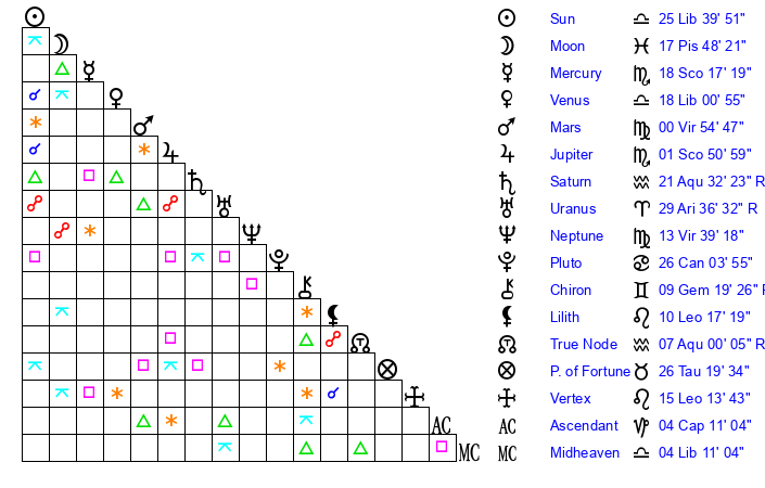 | Moon | 10 Pisces 59 | 1 Libra 8 | 11 Cancer 59 |