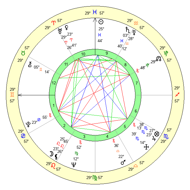 | Sun | 25 Pisces 44 | 26 Pisces 55 | 23 Gemini 14 |