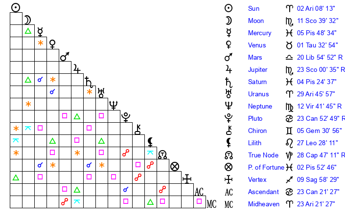 | Jupiter | 22 Scorpio 45 | 14 Gemini 42 | 13 Scorpio 46 |