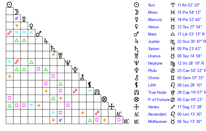 | Venus | 11 Taurus 56 | 27 Pisces 25 | 22 Leo 58 |