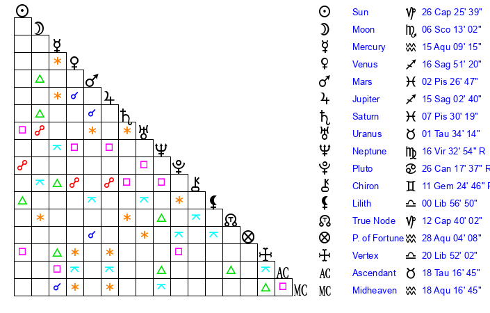 | Sun | 25 Capricorn 58 | 27 Capricorn 24 | 25 Aries 6 |