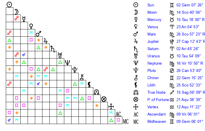 | Neptune | 16 Virgo 10 | 1 Aries 41 | 17 Virgo 50 |