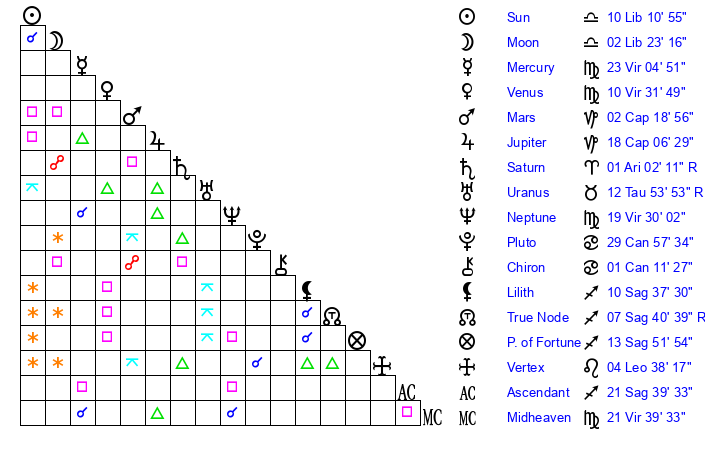| Moon | 25 Virgo 2 | 18 Aquarius 54 | 10 Sagittarius 55 |