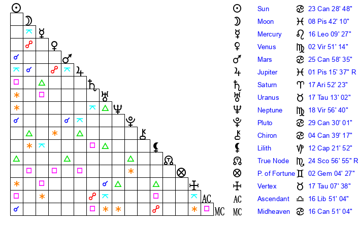 | Sun | 23 Cancer 3 | 24 Cancer 0 | 17 Libra 17 |