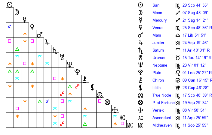 | Sun | 29 Scorpio 18 | 0 Sagittarius 12 | 27 Aquarius 42 |