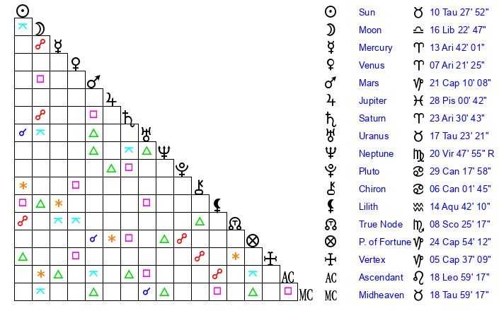 | Sun | 9 Taurus 59 | 11 Taurus 9 | 2 Leo 22 |