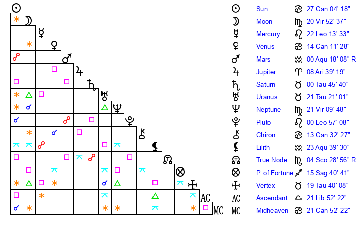 | Venus | 13 Cancer 39 | 17 Gemini 30 | 0 Scorpio 12 |